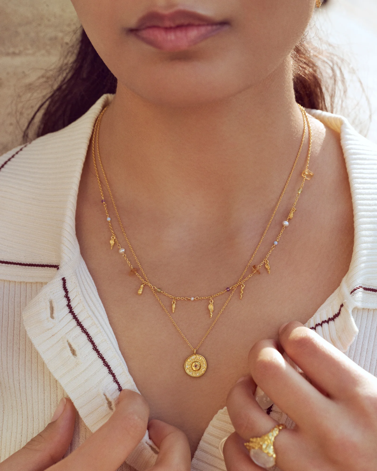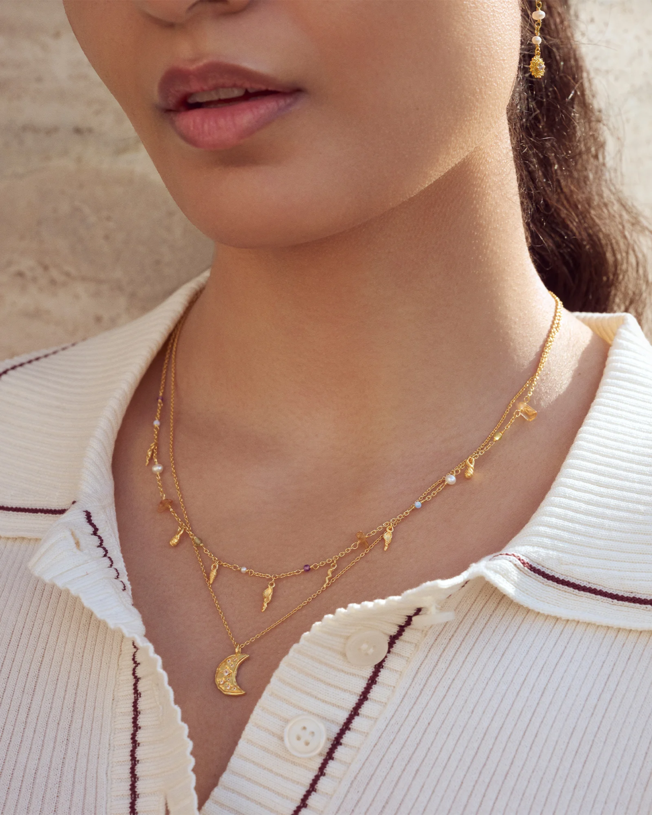 Maanestens forgyldte smykker er lavet af genanvendt sterling sølv (925), forgyldt med 18 karat guld, ofte kombineret med ædelsten. Pas på dem med omtanke, så de bevarer deres glans længst muligt.