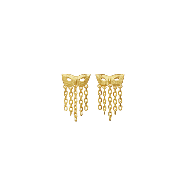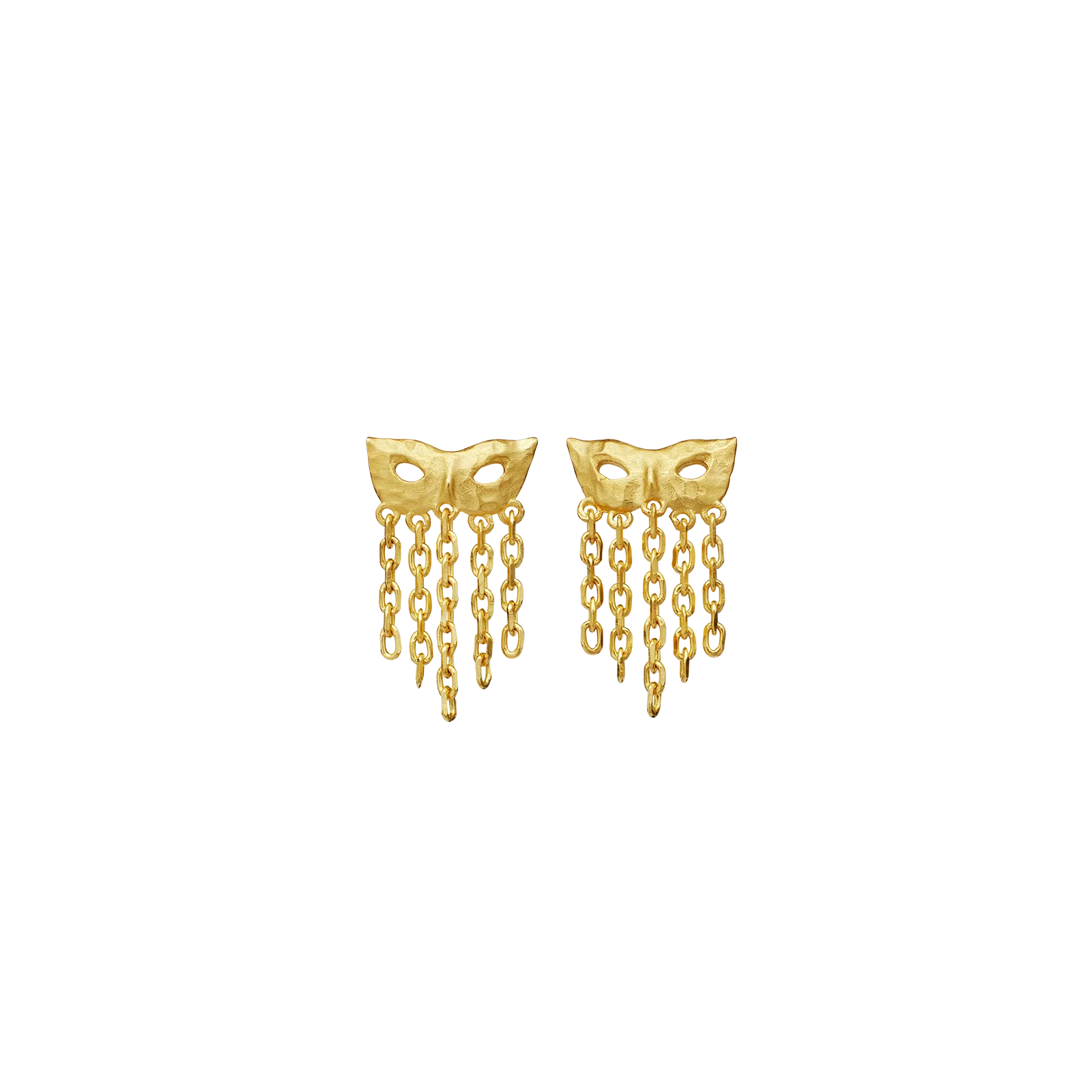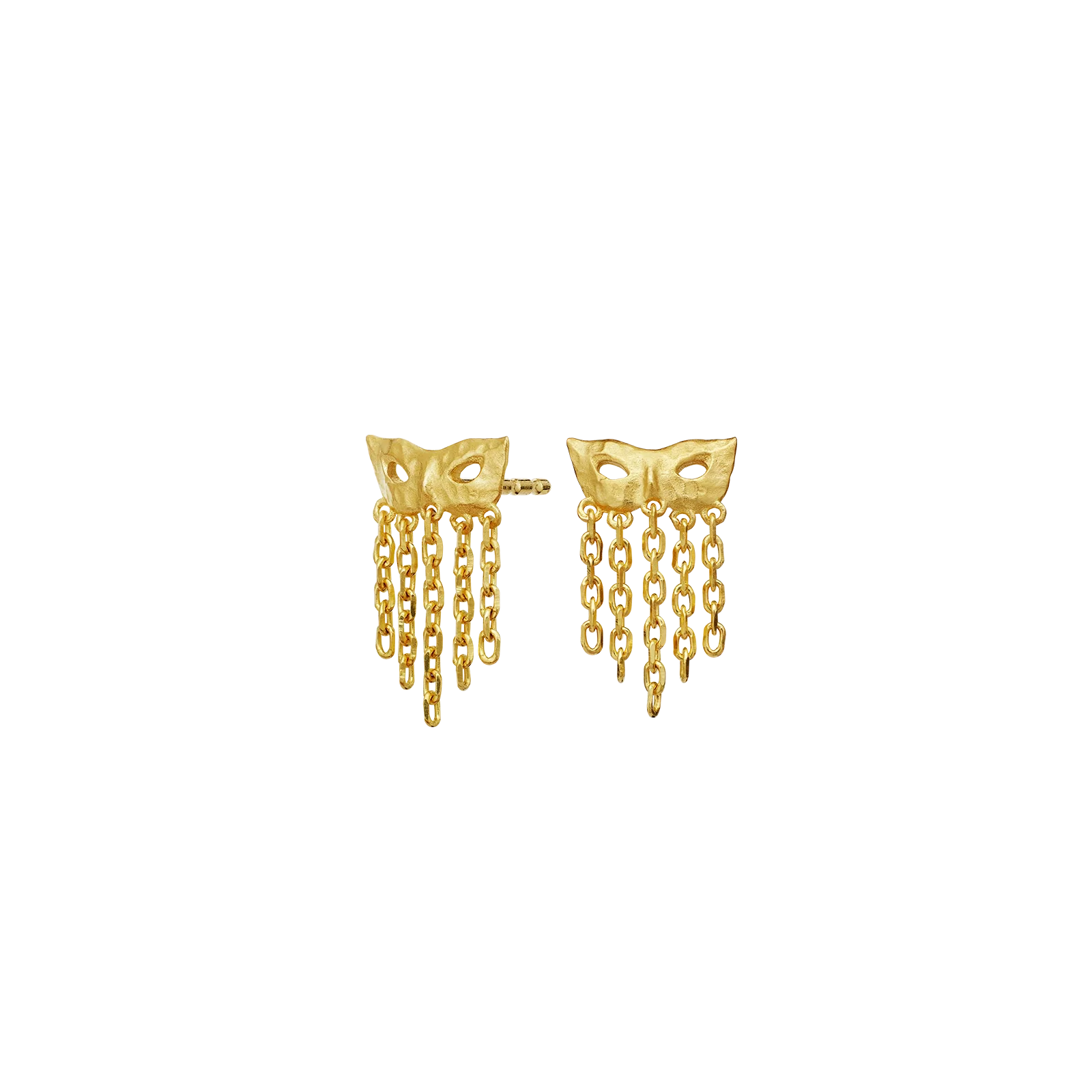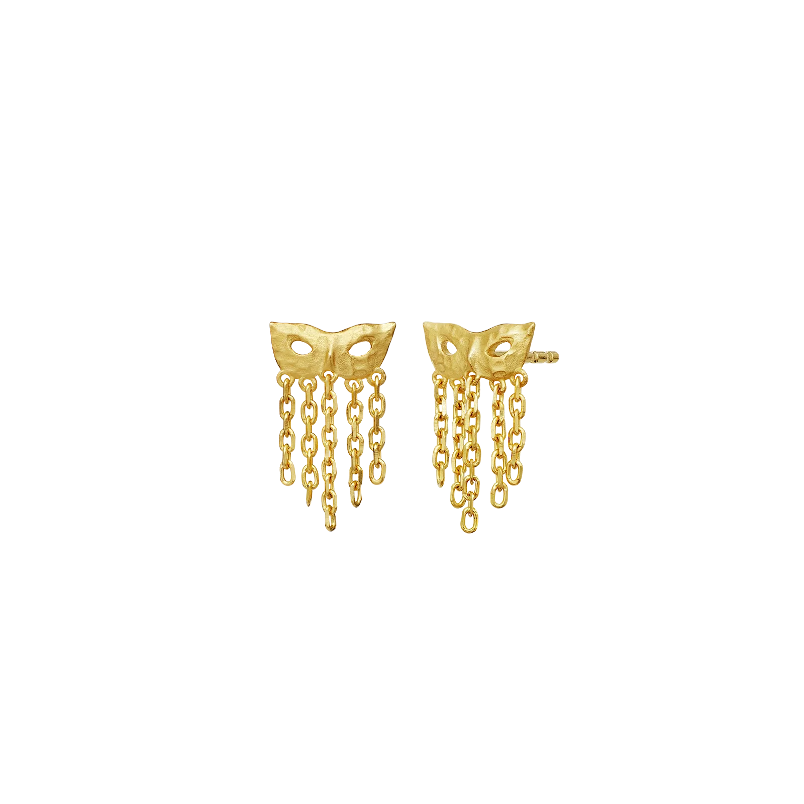 Hvem gemmer du dig for? Vis dit sande jeg med vores Celare Øreringe, der med sin elegante maske og gyldne kæder vil give din dag et magisk teatralsk løft.