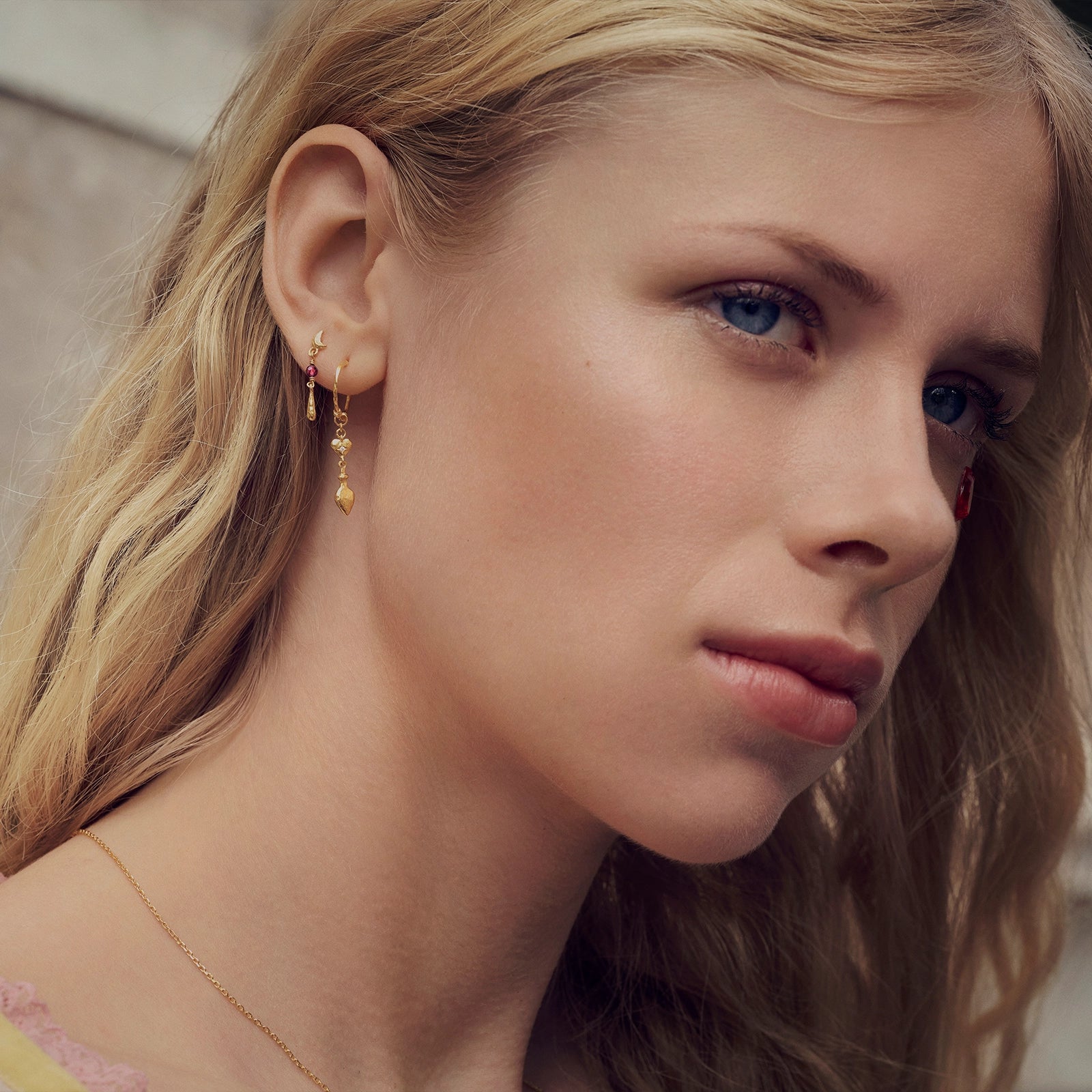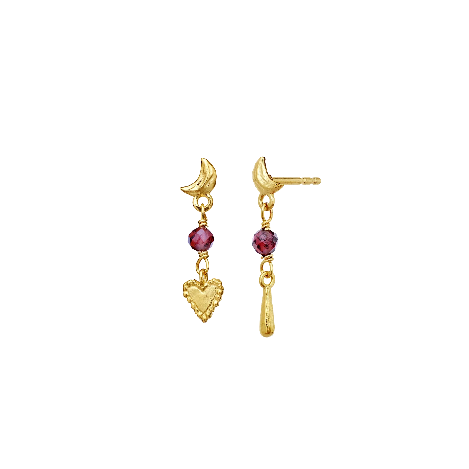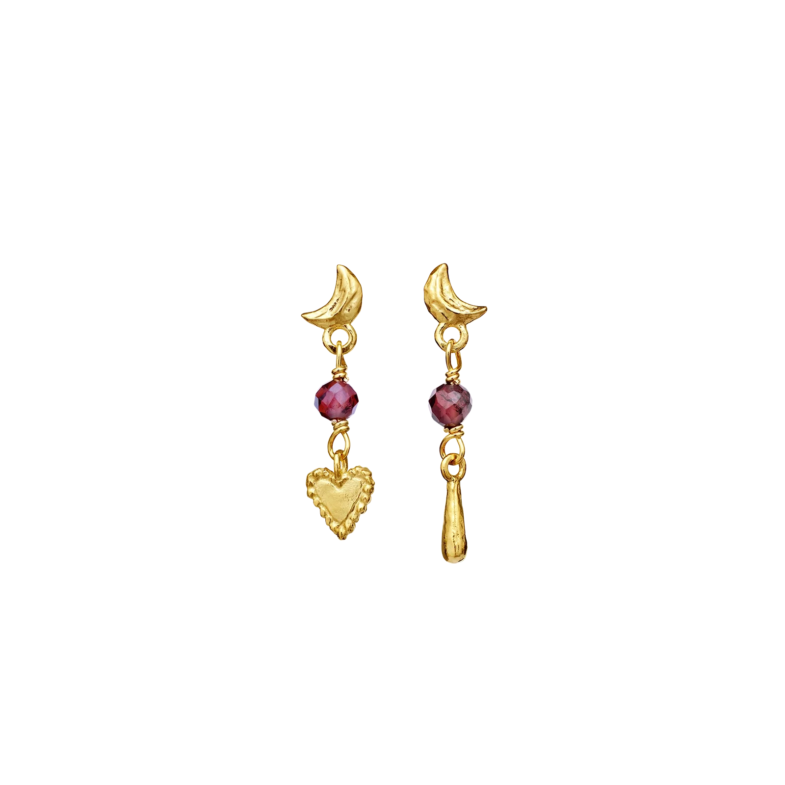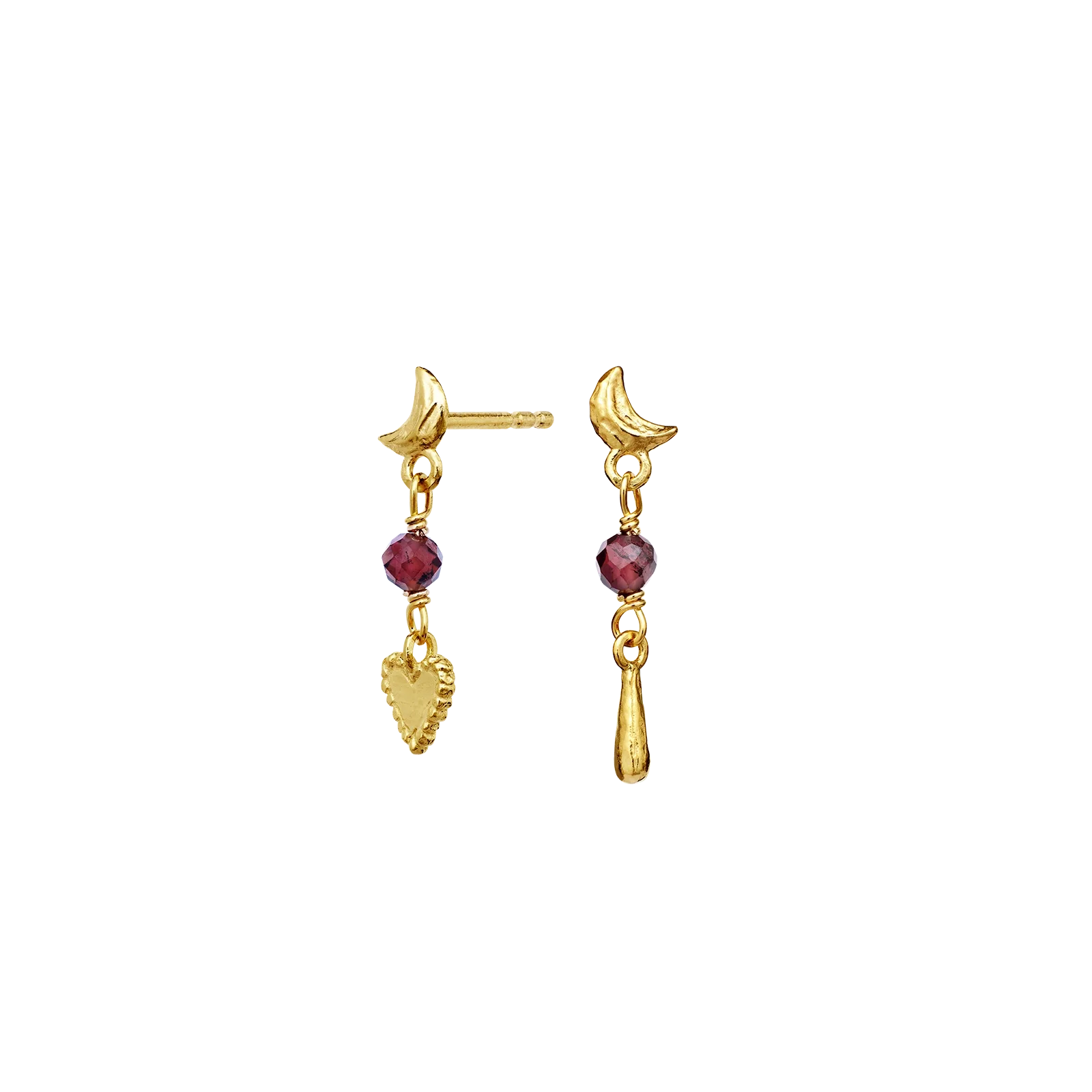 Byd nye begyndelser velkommen med vores Nuova Øreringe. Halvmånerne hvorfra der hænger tråde af pink granater, tårer og hjerter, symboliserer den kærlighed vi alle er omgivet af.