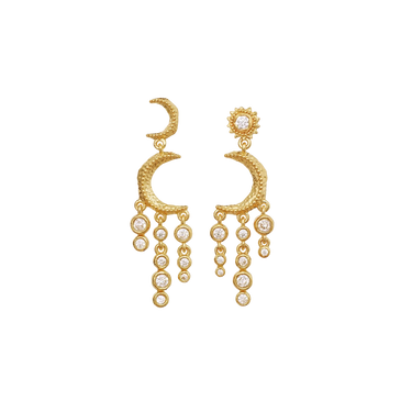 Astrea Twinkle Earrings forener delikate halvmåner med små glitrende steiner som fanger lyset som om de var stjerner på nattehimmelen. Øredobbene er laget av resirkulert sterlingsølv og fås også belagt med 18k gull. De er prydet med glitrende