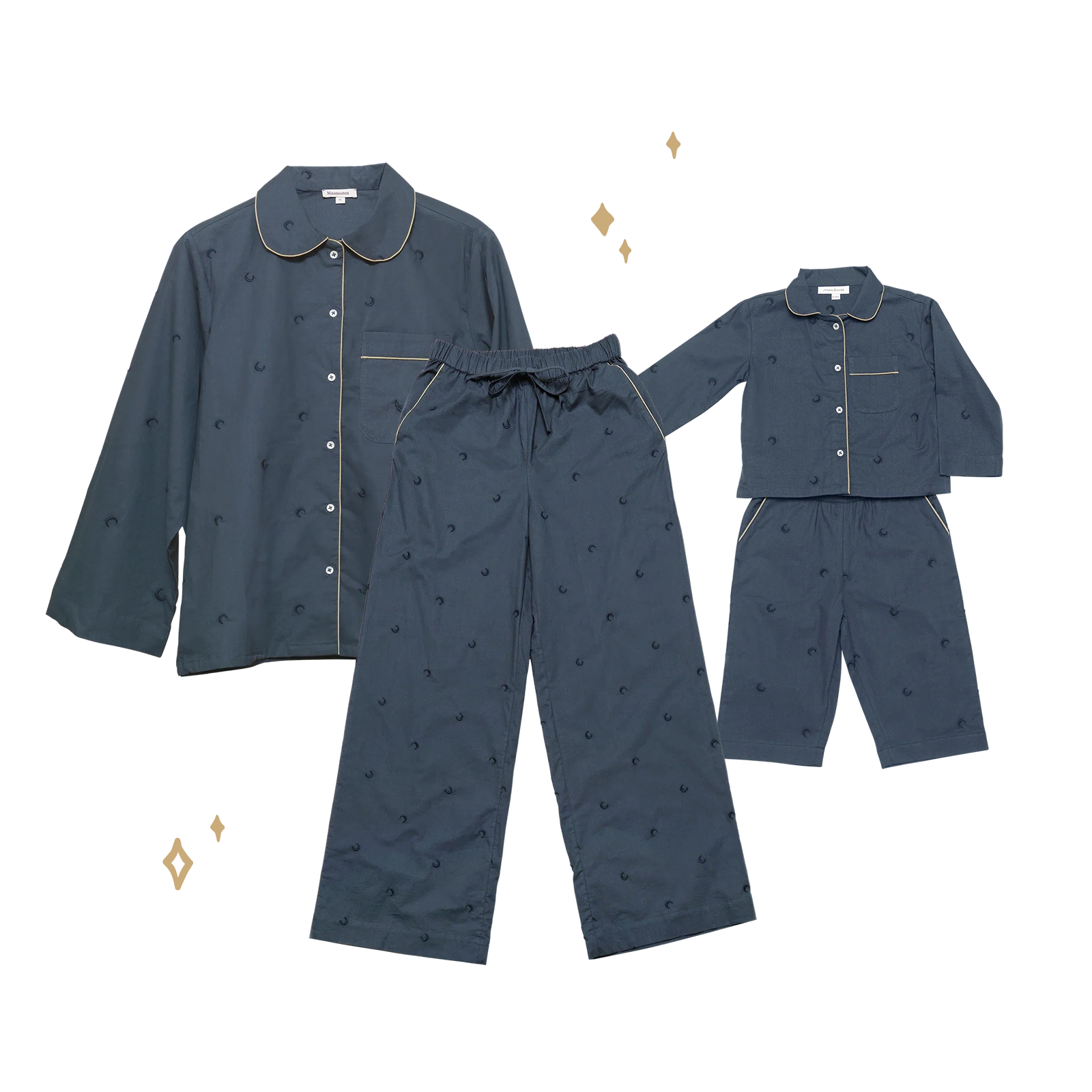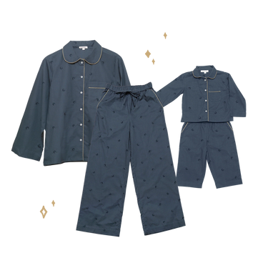 Maanesten Loungewear er lavet i 100% økologisk bomuld til både børn og voksne. Køb dem i Sand eller Navy. Sættet består af pyjamasskjorte og bukser – og lige nu får du et gratis børnesæt med (værdi 550 kr.).